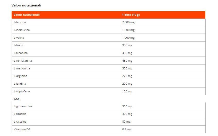 Gli EAA sono una fonte di amminoacidi essenziali che il corpo usa per produrre le proteine. Sono importanti perché favoriscono la crescita e il mantenimento della massa muscolare. L'integratore è arricchito con glutamina, tirosina, cisteina e vitamina B6.