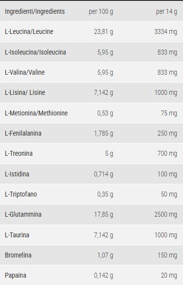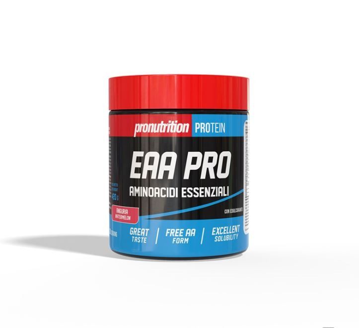 Gli aminoacidi sono molecole organiche composte sia da un gruppo amminico (NH2) che da un gruppo carbossilico (COOH), che, unite fra loro,tramite un legame peptidico vanno a formare la struttura primaria delle proteine. Gli aminoacidi sono piu'di cento ma solamente venti sono definiti proteinogenici perchè concorrono alla formazione delle proteine e quindi sono fondamentali al funzionamento del nostro organismo Di questi solamente 9 vengono definiti essenziali. Con il termine aminoacidi essenziali (dall'inglese Essential Amino Acid – EAA) sono indicati quegli aminoacidi che l'organismo non è in grado di sintetizzare da solo. Quindi devono essere obbligatoriamente introdotti con l'alimentazione.Gli EAA intervengono in innumerevoli processi metabolici cerebrali,fisici immunitari Si trovano in molti alimenti,specialmente in quelli ad elevato valore proteico ma le persone che praticano una intensa attività fisica potrebbero avere un gap proteico da colmare con l'assunzione possibilmente mattutina di EAA anche in alternativa alle proteine Colmare tale gap consente di migliorare la qualità dell'allenamento,stimolando una corretta sintesi proteica ed evitando il fenomeno del catabolismo proteico Pronutrition ha formulato una miscela di EAA di origine vegetale,senza coloranti,senza aspartame, perfettamente bilanciata,perfettamente solubile in acqua e di ottima palabiltà da assumere possibilmente al mattino e comunque a stomaco vuoto per ottimizzare l'assorbimento che si svolge in due fasi:la rottura del legame peptidico nello stomaco e nel duodeno ed il successivo assorbimento nell'intestino tenue. L'elenco e le quantità degli EAA le trovi nella tabella nutrizionale esposte sia per dose consigliata(28g) che per 100g.