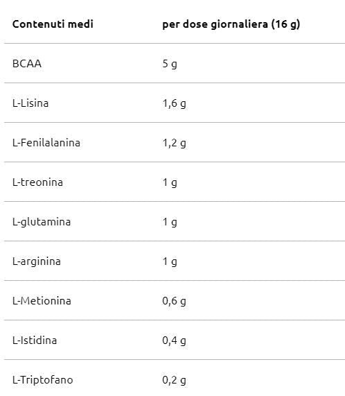 ESSENTIAL AMINO 11 PRO è un integratore alimentare a base di aminoacidi essenziali (EAA) e aminoacidi ramificati (BCAA) che contribuiscono al soddisfacimento del fabbisogno proteico/azotato. Indicato per adulti che praticano sport. Con edulcorante.
