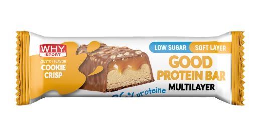Good Protein Bar è una barretta multistrato ricoperta, dal gusto goloso e dalla consistenza morbida. Contiene 36% di proteine, che contribuiscono al mantenimento della massa muscolare, ed è formulata con edulcoranti, risultando a basso contenuto di zuccheri.