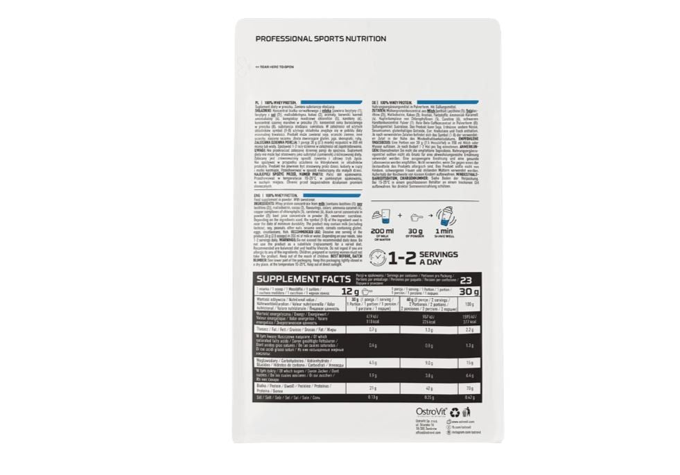 Le proteine del siero di latte sono ottenute dal siero di latte, che è un sottoprodotto della produzione del formaggio. È una fonte animale di proteine, che viene utilizzata dalle persone fisicamente attive, indipendentemente dal loro obiettivo di allenamento, livello di allenamento ed esperienza. Esistono tre tipi di proteine del siero di latte: concentrato di proteine del siero di latte (WPC), idrolizzato di proteine del siero di latte (WPH) e isolato di proteine del siero di latte (WPI). OstroVit 100% Whey Protein utilizza il concentrato di proteine del siero di latte del latte, che si distingue per la buona solubilità, l'eccellente assimilabilità e il breve tempo di assorbimento, che ha un effetto positivo sulla qualità dell'integrazione.