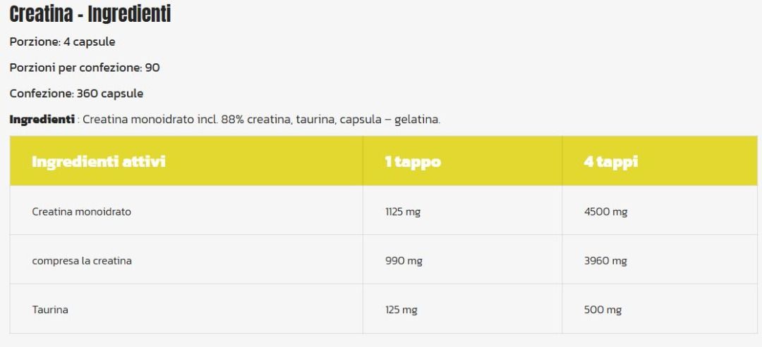 La creatina è un integratore comunemente utilizzato da chi pratica vari tipi di sport. Hiro. Lab Creatine è un integratore alimentare in comode capsule. Ogni capsula contiene un'elevata dose di creatina monoidrato combinata con taurina, che aiuta ad aumentare la forza e la massa muscolare magra.